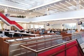For what it's worth, many newsroom walls at The New York Times are bright tomato-soup red. The newspaper's facilities department says there are no blue rooms in the place.