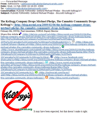 NORML's protest will surely have devastating effects on the cereal business, at least once the chips run out. "Tell them that you oppose their decision to drop Michael Phelps," NORML instrusts, "and that, as a result of their actions, you will not be purchasing any Kellogg's related products for the next three months (or until the company decides to reinstate the Phelps as their spokesperson)." Three months! That'll teach 'em.