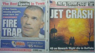 A late-breaking plane crash leads to an unfortunate juxtaposition of covers for the New York Post. They fixed it online. These things happen. [EV Grieve]