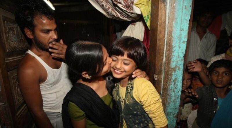 [Slumdog Millionaire's Rubina Ali received a kiss yesterday from a neighbor before heading to the Mumbai airport to catch a plane to Los Angeles for the Oscars; pic via Getty]