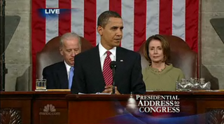 9:24 And your first "mixed applause and boos" line of the night: "And tonight, I am grateful that this Congress delivered, and pleased to say that the American Recovery and Reinvestment Act is now law." Hey, Minneapolis shout-out! There are 57 racist cops who weren't laid off, THANKS OBAMA. (Seriously, Minneapolis cops are really racist.)