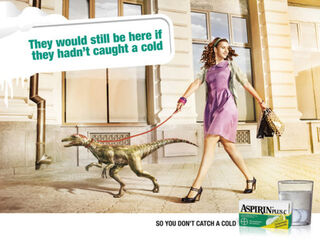 Dinosaurs: "They would still be here if they hadn't caught a cold," says this ad for aspirin-plus-vitamin-C. Product slogan: "So you don't catch a cold." Can you spot the two flaws in this campaign?