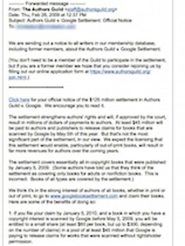 The Authors Guild didn't bother with such details in an email (see below) to members, nor did it explain how a purported $125 million settlement only includes $45 million in author and publisher payments; it offered instead a rosy summation of the lengthy settlement agreement.