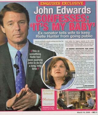 The tabloid's big story, which must be paid attention to because the Enquirer totally called the affair thing, so who knows, is that Edwards told his "DYING WIFE" Elizabeth he really is the father of his mistress' kid, despite what he told her and ABC News and America all of six months ago, when he admitted the affair.