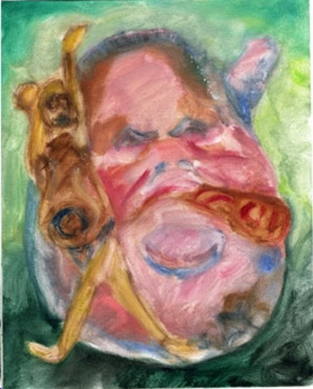 At left you see the early stages of the Rush-as-Jabba-the-Hut painting in progress, which the intrepid artist went ahead and started even before voting had concluded. This vivid tableau narrowly edged out "Rahm Emanuel, riding either a white Siberian tiger or an oversized grey wolf, leaping across a mountain of giant pancakes." Coming in third, with 26% of the vote, was "Rachel Maddow riding a be-saddled Keith Olbermann into battle with a lance and pancake shield against a comparably-though-perhaps-differently-armored Limbaugh riding Hannity."
