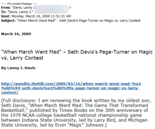 The book, by his son Seth, is about the 1979 NCAA basketball national championship game, between Larry Bird and Magic Johnson. Hah, there is a metaphor in there, somewhere, right?
