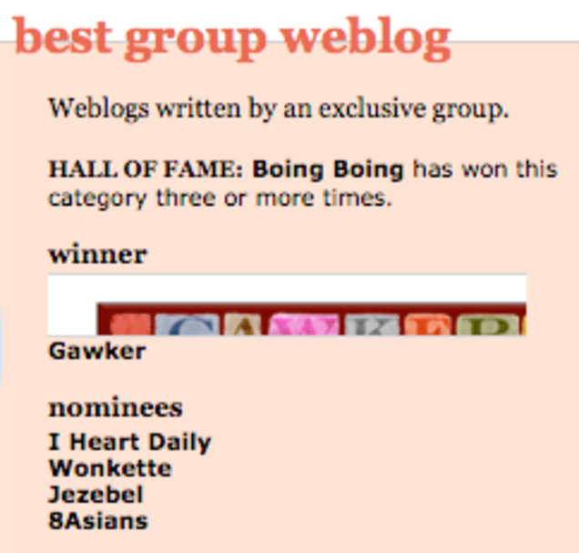 You may have started the day thinking you were reading any old gossip rag, but the people have clicked and Gawker is your best group blog of the 2009 Weblog Awards.