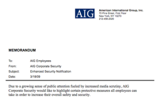 An AIG corporate security memo, leaked to Gawker, advises employees on how not to fall victim to the populist horde calling for their heads. Click to see it in full.