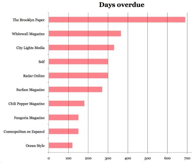 The chart above shows the ten longest waiting times we heard about. If you're responsible for paying people at one of the places named above and are unhappy with where you rank, we encourage you to start cutting the checks due to your freelancers. If you've gone through all your invoices and still think we're flat-out wrong, you can also email us. But we highly urge the former.
