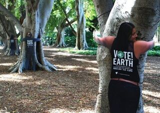 Good one: cutouts of "tree huggers," wrapped around actual trees, urging you to "VOTE EARTH" by switching off your lights for an hour. These cutouts are made of cardboard.