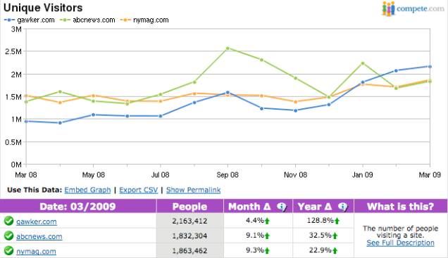 Compete.com released their monthly unique visitor numbers today and Gawker had another strong month, staying ahead of old-line (and much larger) outfits like ABCNews.com and NYMag.com.
