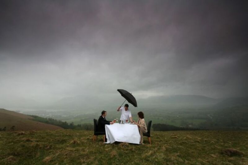 [Diners are served an alfresco meal at the summit of Latrigg, in England's Lake District, as part of the Keswick Mountain Festival; image via Getty]