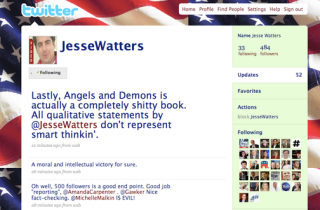 We have Washington Times columnist and Fox News regular Amanda Carpenter to thank for revealing the fake. She wrote on her Twitter page today that "@JesseWatters is a BOGUS account. This is not the real Factor producer Jesse Watters. Block this feed, do not follow. It is an imposter." Later she added that she had spoken to Watters (how'd you get him to talk to you!?) and confirmed. The faker admitted the con job on his page today.