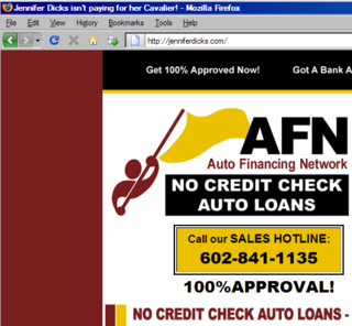 If you are Jennifer Dicks of Phoenix, the answer is the latter. See, Dicks got a loan from the "Auto Financing Network" and bought a Chevy Cavalier. She fell behind on payments! And then the president of the company started obsessively texting her, and then they registered the url of her name to plant a site titled "Jennifer Dicks isn't paying for her Cavalier!" and they claimed to have installed a GPS tracking device in her car and basically it was a lot of weird stalker shit.