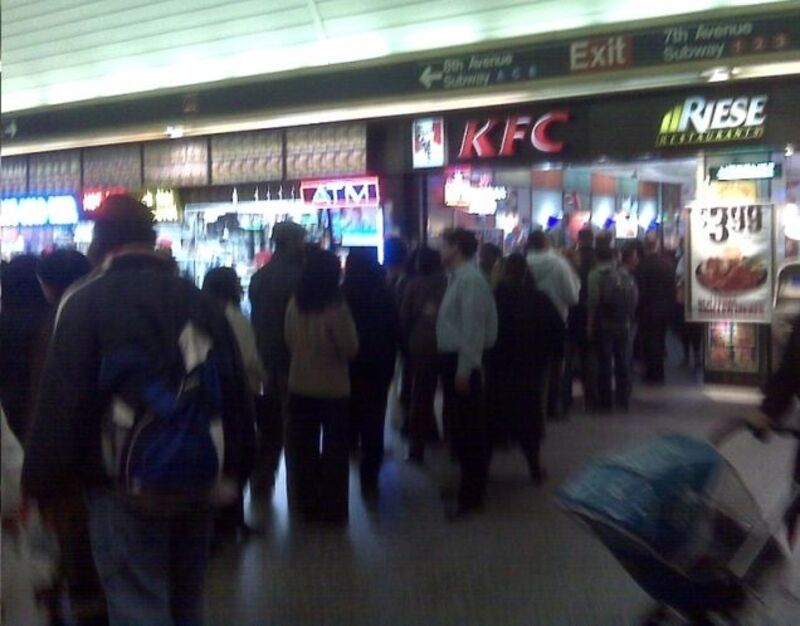 In the breathtaking and blurry pic above, a line stretches outside the Penn Station KFC yesterday—a line that would soon morph into a full-blown public protest, in favor of free chicken. The manager of the store now says that the coupons will be honored today, as well, so rush right down there, everyone! But the KFC panic was widespread; look at this violent report from North Carolina: