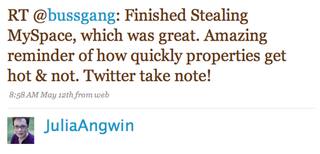 Tech editor Julia Angwin retweets fans of her new book, Stealing MySpace.