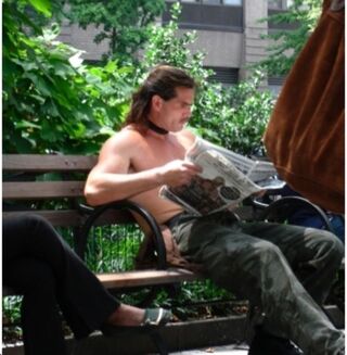 Mike Nelson is the big dude who's the subject of the FindHeMan.com stalker blog. But the joke is it's not that hard to find Mike really cause he spends a lot of time in Madison Square Park, sunning the guns and the lats and the chest and the other important He-Man parts. He lost one eye in a fight with cops and used to be a druggie but cleaned up. Now he doesn't do acid or coke or heroin or rob cemeteries for skulls any more; he just lives with his girl and works out and hangs out and basically goes with the flow: