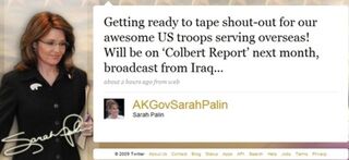As we already know, Sarah Palin has the weirdest looking Twitter page in the world. And as we also already know, and this is maybe more relevant, Conservatives don't understand that Stephen Colbert is joking. So basically this is a double-whammy of "Sarah Palin sure is dumb" news, right here. Shhh, no one tell her!