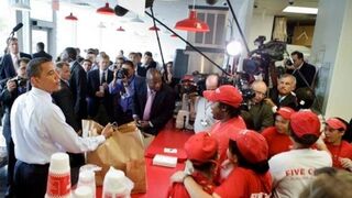 [Get it? That's our president, Barack Obama, at a Five Guys burger shack in Washington DC, pickin' up lunch for everyone like a real regular fellow; image via Getty]