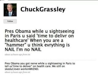 Big thanks to Gawker commenter/liveblogger extraordinaire for tipping us to Grassley's tweets.