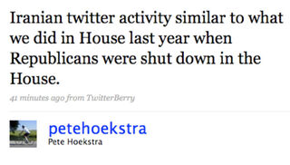 Who let Republicans use the Twitter? Who told them that was ok? Michael Steele? "Iranian twitter activity similar to what we did in House last year when Republicans were shut down in the House," Representative Pete Hoekstra says.