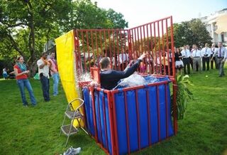 [White House Press Secretary Robert Gibbs gets dunked during a luau (an Indonesian luau perhaps???) held on the South Lawn yesterday for members of Congress and their families; image via Getty]