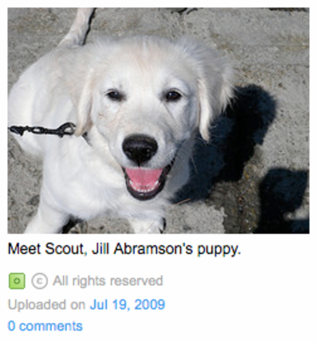 Jill Abramson, New York Times managing editor for news, has a new column: "This is the first article in a weekly series about the challenges and satisfactions of raising a puppy through its first year of life."