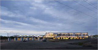 The General Services Administration contracted an expensive architecture firm to design a new border crossing station up in some godforsaken part of far northeastern New York State, as part of their "let's make government buildings look nice again like they did in the '30s" program. The centerpiece of the station design: "glossy yellow, 21-foot-high letters spelling 'United States.'" Sounds neat!