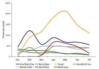 Dropping off their Twittering this summer are such familiar Twitterti as music writer Touré; Air America snarker Ana Marie Cox; New York Times Oscar obsessive David Carr; Times "conceptual scoop" artist Jennifer 8. Lee; celebrity journalism diva Bonnie Fuller; Yahoo vlogger Sarah Lacy and Digg perpetrator Kevin Rose. See the chart above, assembled with help from tweetstats.com (until we melted their servers by asking for numbers on Times Twitterer-in-Chief Brian Stelter).