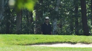 [President Barack Obama looks for his ball in the woods today at the Farm Neck Golf Club in Oak Bluffs on Martha's Vineyard. Image via Getty]