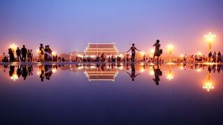 [Tourists in Tiananmen Square in Beijing enjoy the decorations for National Day to commemorate the 60th anniversary of the People's Republic of China and intimidate us Americans. But, ooh, pretty pictures! Image via Getty]