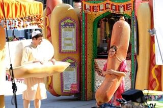 [Michael Urie and American Ferrera get into their meaty roles on the set of Ugly Betty in Manhattan yesterday. Photo via Getty]