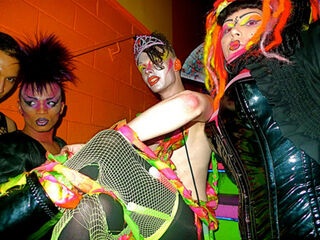 At 1am, the line at Santos stretched down the block, and like Irishmen at a wake, the crowd turned out for a fabulous funeral and they weren't disappointed. Herra-C in a silver lamé jumpsuit, pink wig, and a face of makeup that was between the Joker and V for Vendetta sashayed across the stage in the main room, leading a group of outlandishly dressed kids—one sporting a tinsel wig, one in a mask of a swan with a huge floppy black bow-tie and suspenders—with protest signs reading the drag personalities in the audience. The basement of the club hosted Choice Cunts, a lesbian party that packed the room, while their gay brethren churned to house music upstairs, with a smattering of straight people all around. This is what the "new" nightlife is supposed to be: mixed, crazy, creative.