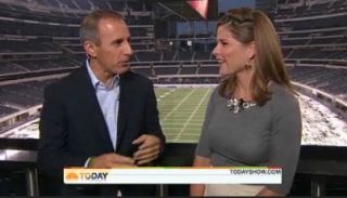 Could there be a more appropriate place for The Today Show to introduce their new hire than Cowboys Stadium, the citadel of hideous American excess, out in that vast expanse of glorious, cement kiln soot-laden sprawl midway between Dallas and Fort Worth? (Wikipedia notes that Arlington is "the largest city in the world without a fixed bus route system of mass transit." Everyone's carbon footprint is bigger in Texas!)
