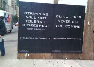 The ads were poetic ditties of white text on a black background. Like: "Blind girls never see you coming" and "Strippers Will Not Tolerate Disrespect (Just Kidding)."