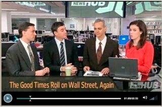 The Journal could cut some costs by slicing its ridiculous video army down to one guy, plus a cameraman with a cheap recorder, and maybe a video editor. After all, as Current TV's Brett Erlich has show, it's possible to create some seriously fun financial programming with bare-bones production values. Or the Journal can just keep imitating cable news networks, even to the point of absurdly saying "we're running out of time," as the host did toward the end of today's "AM Report." After all, it's not like News Corp. owns a real financial net of its own, or anything.