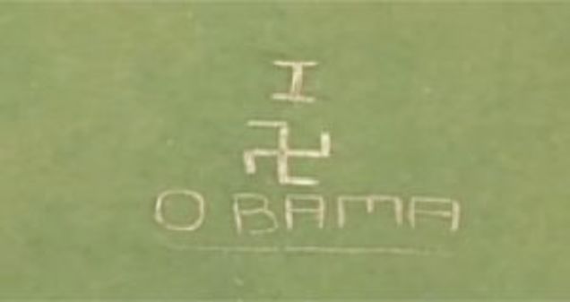 What does it mean? Did an actual Obama-admiring Nazi carve this in the golf course? Is something threatening the president with something? No one will ever know!