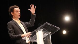 [Malcolm Gladwell is so scared by the invisible podium at the New Yorker Festival on Saturday that he almost takes a spill. Image via Getty]