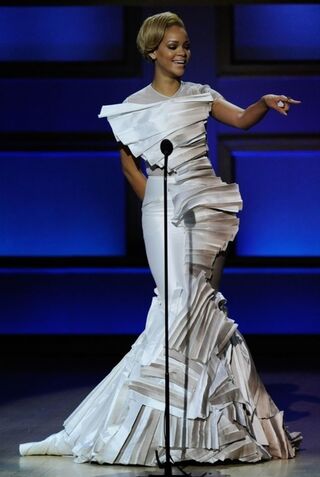 [Rihanna points to the miniature trailer park that her twister of a gown is going to destroy after speaking at the Glamour magazine Women of the Year Awards at Carnegie Hall last night. Image via Getty]
