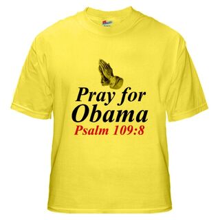Anyway, now it's a real thing: CafePress is selling T-shirts and bumper stickers, the Christian Science Monitor is wondering whether it's "funny or sinister" to pray for Obama's death, and Rachel Maddow referenced it last night on her show.
