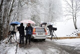 [Members of the media brave the snow and gather outside Roman Polanski's chalet in Gstaad, Switzerland, waiting for the director to be placed under house arrest in the building. Image via Getty]