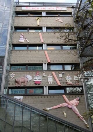 But some people found this sculpture to be in poor taste! Some people like the new managing editor of Taz. But she cannot have it removed, because the leftist newspaper makes decisions based on direct democracy, and no one can agree on what to do about the giant penis on their building.