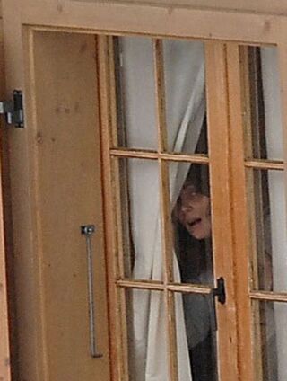 [Roman Polanski's wife, Emmanuelle Seigner, creates her own horror movie one-sheet as she peers out the window of the Gstaad, Switzerland, house where her husband will soon be held under house arrest. Image via INF]