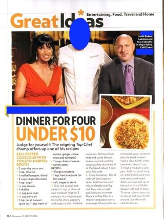 Thanks to a tip-off from Gawker alum Richard Lawson, we know that Page 134 of the December 21 issue (the one with Tiger's wife on the cover) shows the above picture with the winner hugging Tom Colicchio and Padma's bad idea bangs. The copy refers to the person in the picture as the "reigning Top Chef champ" and the photo caption says "[the winner]...beat out [the losers]." There is also a recipe for Bell Pepper Couscous with Tomato-Harissa Broth. Don't make it. If you eat it, you will be able to tell the future, but all your friends will hate you for revealing events before they occur.