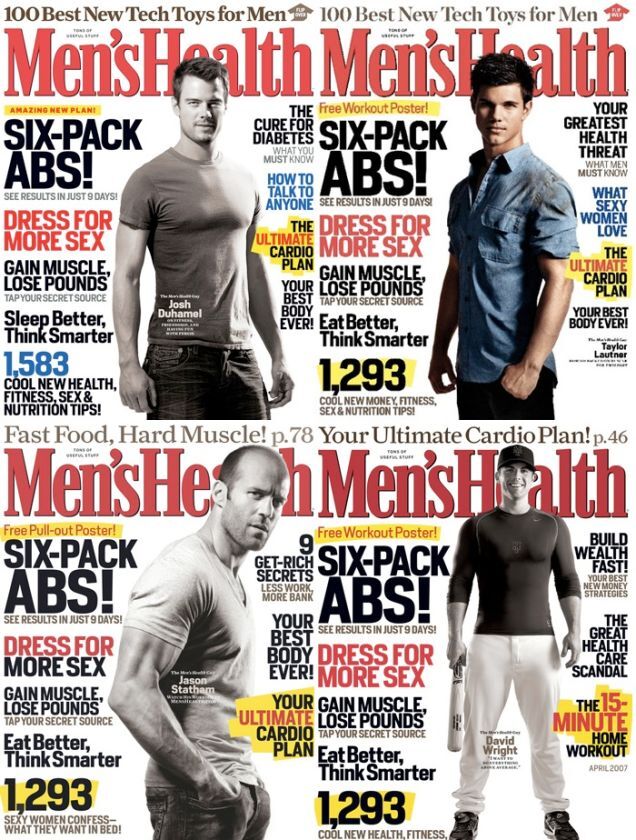 There are in fact, just four basic templates for a Men's Health cover. Since 2007, Men's Health has led with "Flat-Belly Foods," "Get Back Into Shape," and "Lose Your Gut" at least twice a year, and a "Six-Pack Abs" at least once a year since 2005.