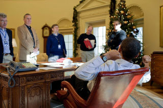 Virginia Gov. Tim Kaine was a guest today on a WTOP radio show in Washington, D.C., so Obama called in to wish him a Merry Christmas. He's got plenty of time to kill—according to the latest White House pool report, Obama just announced in the Roosevelt Room that he's not leaving for his Hawaiian holiday until the Senate passes a healthcare bill on Christmas Eve. "My attitude is if they are making these sacrifices to provide health care to all Americans, the least I can do is be around." Which means plenty of time to kill til then. Also, contrary to our report yesterday, the White House press corps won't have it any better than their counterparts on the Hill after all.