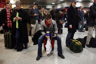 [Stranded travelers fiddle with their hand-held devices in Penn Station today when all trains out of the city were suspended for nearly three hours due to an electrical problem. Image via Getty]