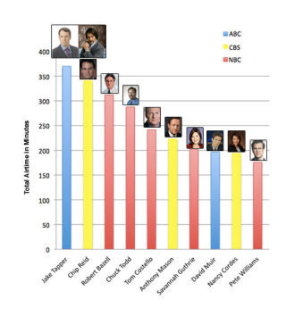 Tapper beat out that loser Chip Reid over at CBS by a full half-hour, and Chuck Todd, the lazy new guy on the White House beat, only ranked fourth. (Tyndall's rankings are limited to network newscasts, because nobody has time to watch all that cable news.) Interestingly, despite the perception that network newscasts are devoted exclusively to stories about prostate cancer and pills, the only medical reporter who cracked the top 20 in 2009 was NBC News' Robert Bazell.