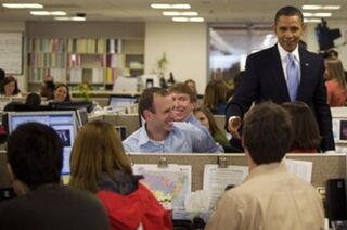 (Top pic: Obama at the DC Red Cross office today, with the unidentified man (center) who actually typed the historic tweet.)