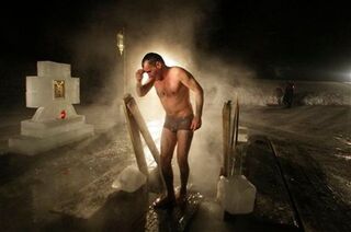 [This man was one of thousands who emerged from the Moskva River into the -13° air in Moscow today during a Russian Orthodox ritual celebrating Epiphany. Image via AP]